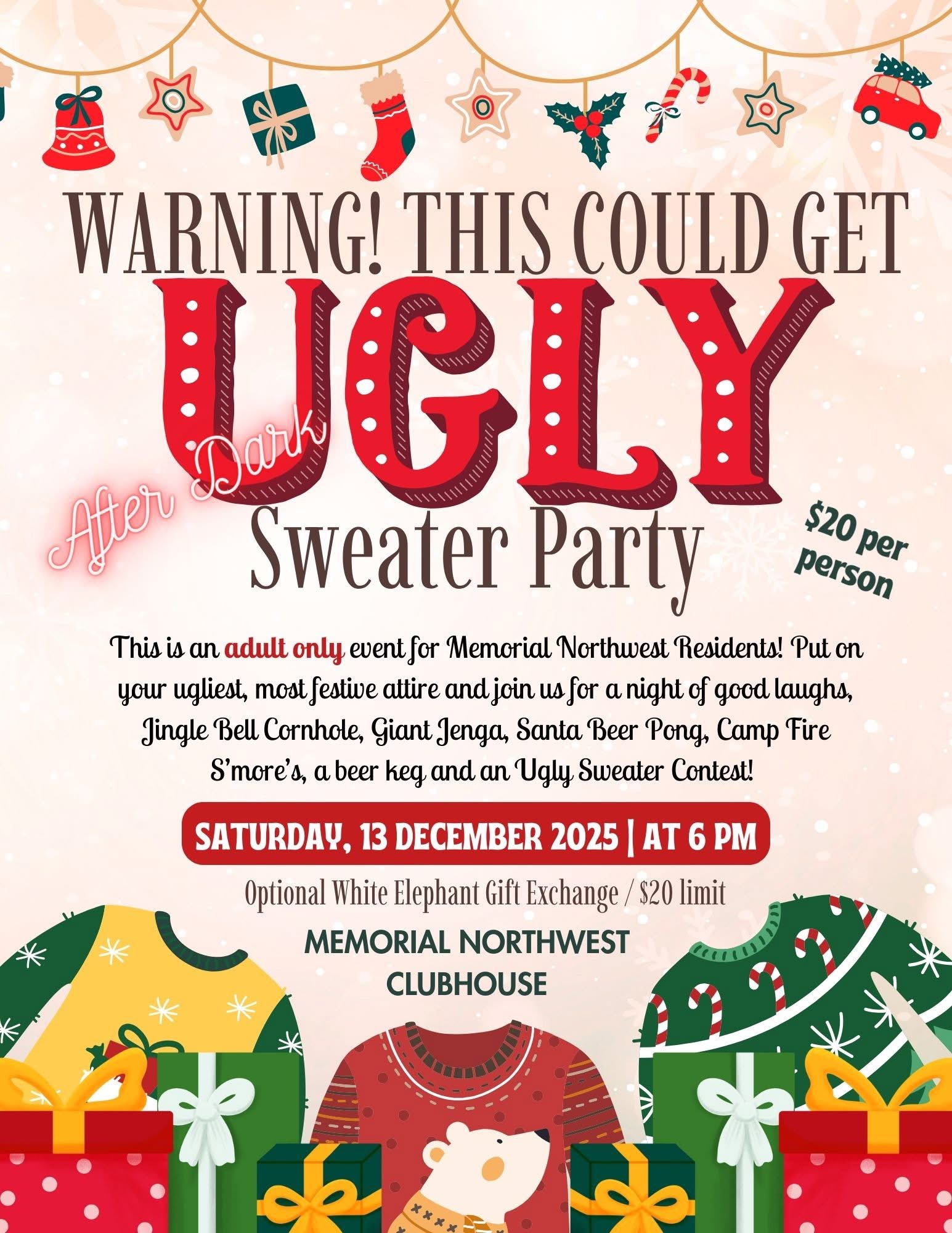 This is an adult only event for Memorial Northwest Residents! Put on your ugliest, most festive attire and join us for a night of good laughs, Jingle Bell Cornhole, Giant Jenga, Santa Beer Pong, Camp Fire S’more’s, a beer keg and an Ugly Sweater Contest!